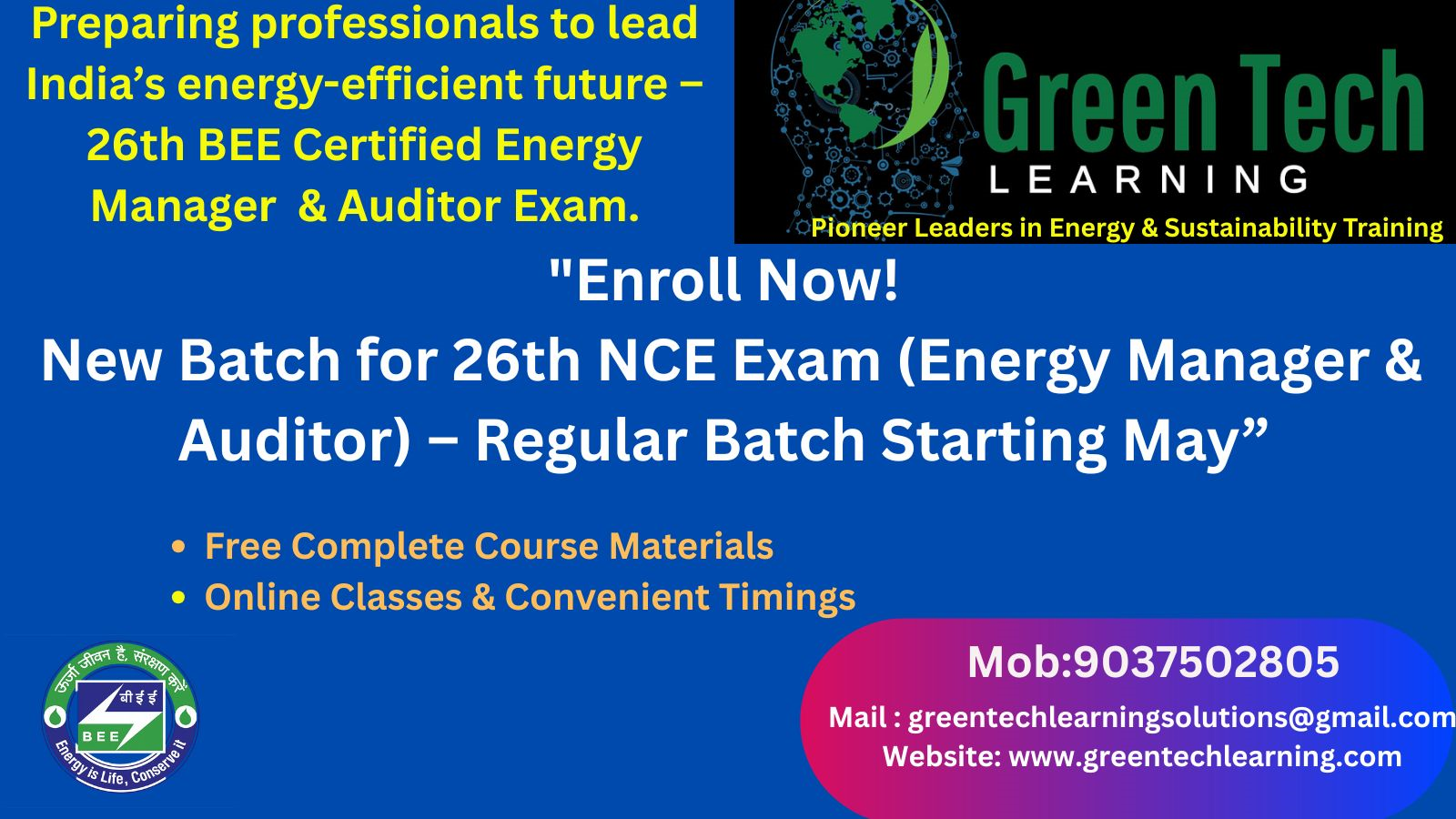 Enroll Now: New Batch for the 26th National Certification Examination (NCE) for Energy Manager & Energy Auditor Online Classes starts in May